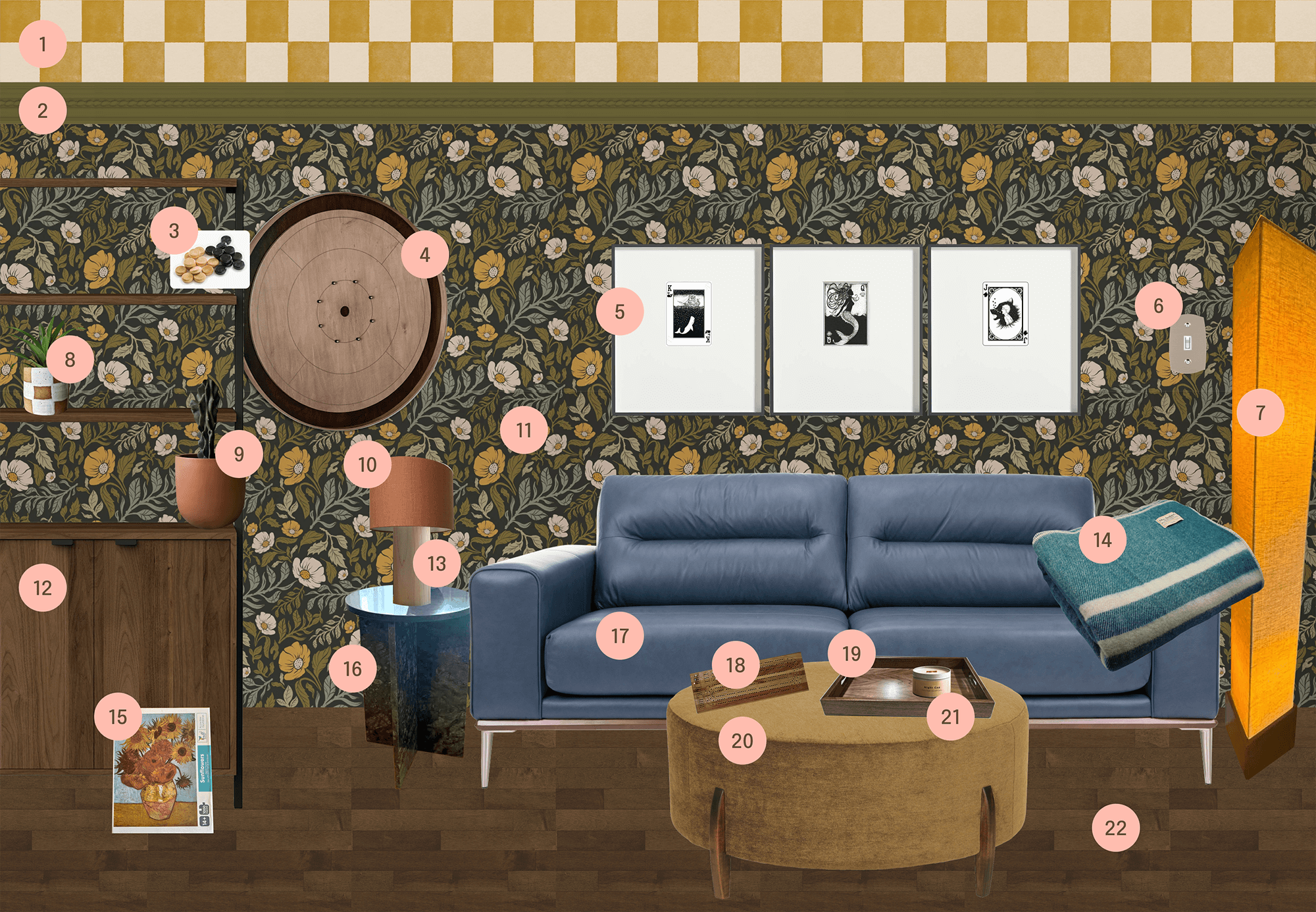 I came across this wallpaper, and the combo of the checkerboard pattern with the mustard colour had me seeing visions of board games and somewhere everyone could get comfy and hang out. With that as my guide, I wanted to build a cozy lounge-style games room where people of all ages would feel welcome.